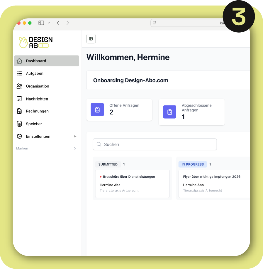 → Aufgaben werden direkt über das Kundenportal eingereicht. Dort kannst du Briefings anlegen, Dateien hochladen und den Status deiner Aufgaben verfolgen.