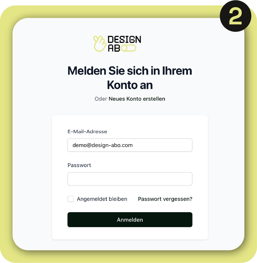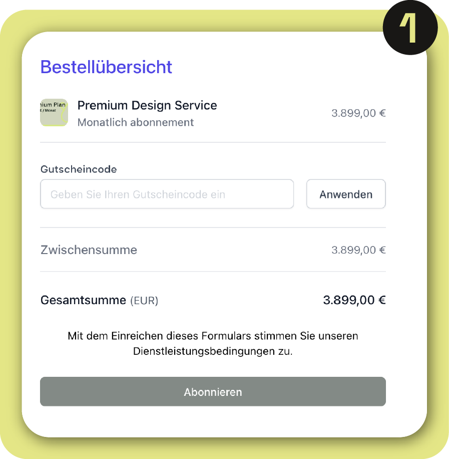 Du abonnierst das Design-Abo und gibst deine Zahlungsdaten ein. Im Anschluss erhältst du per Mail die Einladung für dein Kundenportal.